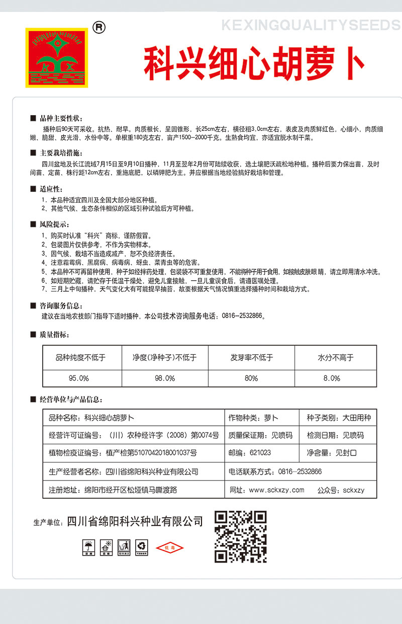 播種后90天可采收,抗熱.耐早,肉質根長,呈圓錐形,長25cm左右,徑相3.0m左右,表皮及肉質鮮紅色,心細小,肉質細.脆甜.皮光滑,水份中等。單根重180克左右,畝產1500-2000千克。生熟食均宜,亦適宜脫水制干菜。