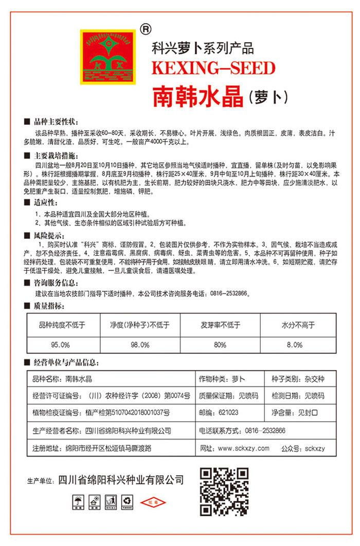 該品種早熟.播種至采收60-80天,采收期長,不易糠心。葉片開展,淺綠色。肉質根圓正,皮薄,表皮潔白。汁多脆嫩,清甜化渣,品質好,可生吃。一般畝產4000千克以上。