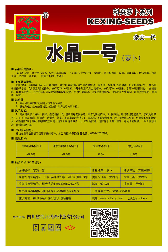 該品種早熟.播種至采收60-80天,采收期長,不易糠心。葉片開展.淺綠色,肉質根圓正,皮薄,表皮潔白,汁多脆嫩,清甜化渣,品質好,可生吃。一般畝產4000千克以上。