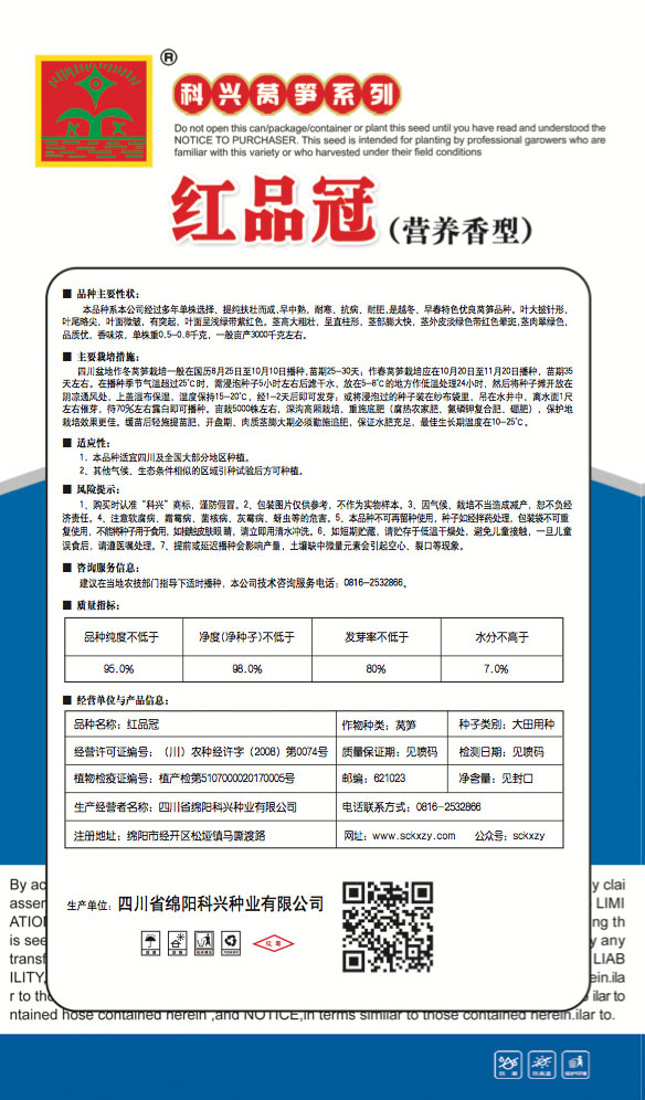 1、購買時認準“科興”商標,謹防假冒。2、包裝圖片僅供參考,不作為實物樣本。3.因氣候、栽培不當造成減產,想不負經濟責任。4.注意軟腐病、灰需病、菌核病、蚜蟲等的危害。5、本品種不可再留種使用、種子如經拌藥處理,包裝袋不可重復使用,不能將種子用于食用.如接觸皮膚眼睛,請立即用清水沖洗。6,如短期貯藏,請貯存于低溫干燥處,避免兒童接.一旦兒童誤食后.請遵醫處理。7、高溫季節栽培易抽苔,因此要加強肥水管理,否則會造成產量降低。萵筍不宜連作.連作病蟲害嚴重