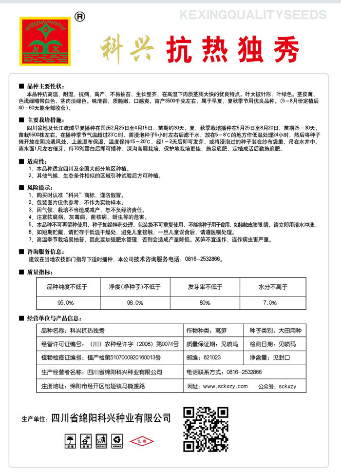 1、購買時認準“科興”商標,謹防假冒。2、包裝圖片僅供參考,不作為實物樣本。3.因氣候、栽培不當造成減產,想不負經濟責任。4.注意軟腐病、灰需病、菌核病、蚜蟲等的危害。5、本品種不可再留種使用、種子如經拌藥處理,包裝袋不可重復使用,不能將種子用于食用.如接觸皮膚眼睛,請立即用清水沖洗。6,如短期貯藏,請貯存于低溫干燥處,避免兒童接.一旦兒童誤食后.請遵醫處理。7、高溫季節栽培易抽苔,因此要加強肥水管理,否則會造成產量降低。萵筍不宜連作.連作病蟲害嚴重