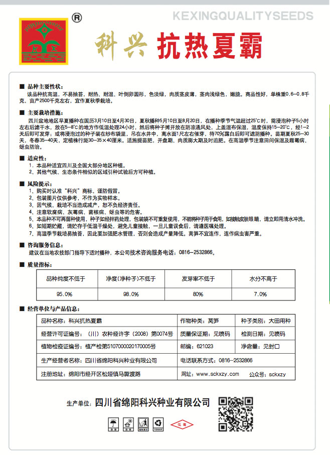 1、購買時認準“科興”商標,謹防假冒。2、包裝圖片僅供參考,不作為實物樣本。3.因氣候、栽培不當造成減產,想不負經濟責任。4.注意軟腐病、灰需病、菌核病、蚜蟲等的危害。5、本品種不可再留種使用、種子如經拌藥處理,包裝袋不可重復使用,不能將種子用于食用.如接觸皮膚眼睛,請立即用清水沖洗。6,如短期貯藏,請貯存于低溫干燥處,避免兒童接.一旦兒童誤食后.請遵醫處理。7、高溫季節栽培易抽苔,因此要加強肥水管理,否則會造成產量降低。萵筍不宜連作.連作病蟲害嚴重