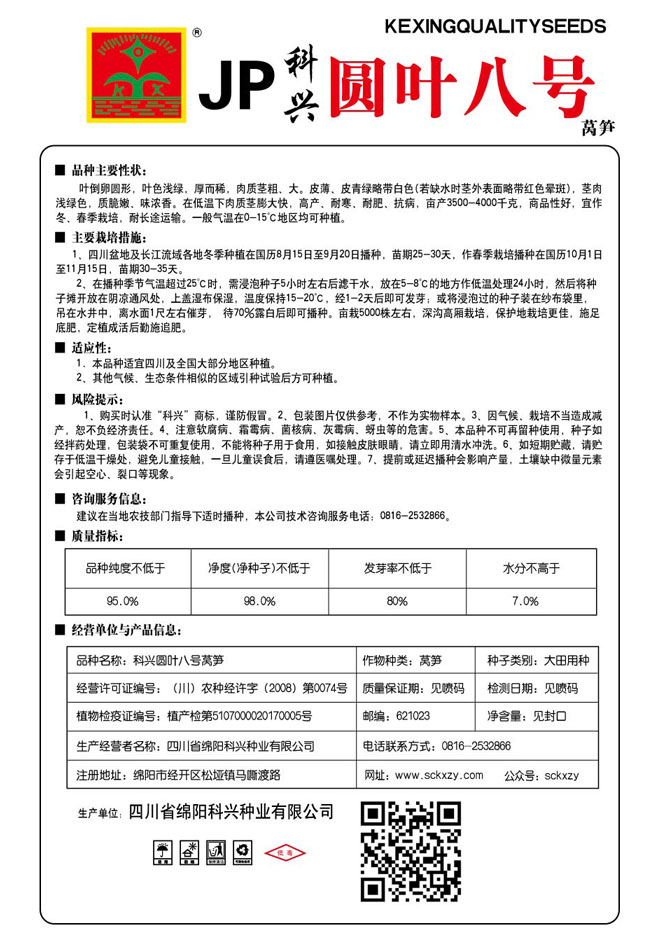 1、購買時認準“科興”商標(biāo),謹防假冒。2、包裝圖片僅供參考,不作為實物樣本。3.因氣候、栽培不當(dāng)造成減產(chǎn),想不負經(jīng)濟責(zé)任。4.注意軟腐病、灰需病、菌核病、蚜蟲等的危害。5、本品種不可再留種使用、種子如經(jīng)拌藥處理,包裝袋不可重復(fù)使用,不能將種子用于食用.如接觸皮膚眼睛,請立即用清水沖洗。6,如短期貯藏,請貯存于低溫干燥處,避免兒童接.一旦兒童誤食后.請遵醫(yī)處理。7、高溫季節(jié)栽培易抽苔,因此要加強肥水管理,否則會造成產(chǎn)量降低。萵筍不宜連作.連作病蟲害嚴重