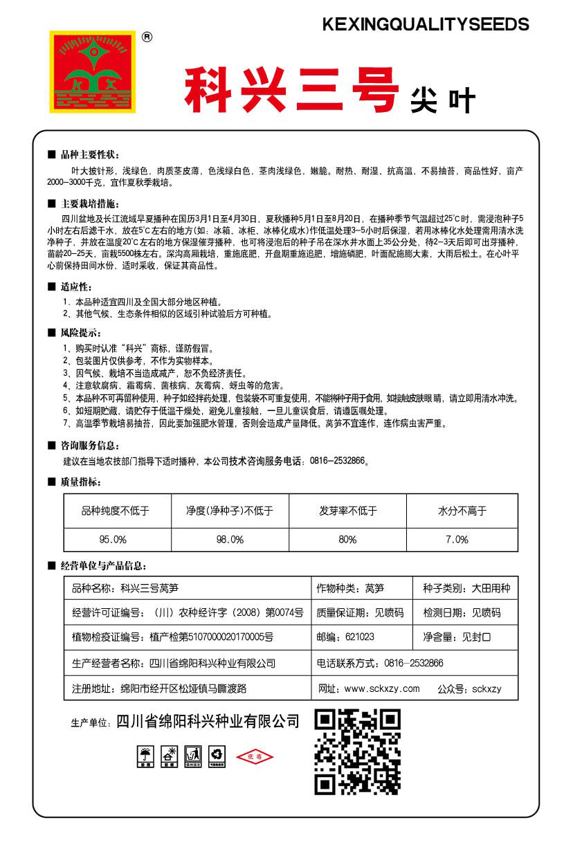 1、購買時認準“科興”商標,謹防假冒。2、包裝圖片僅供參考,不作為實物樣本。3.因氣候、栽培不當造成減產,想不負經濟責任。4.注意軟腐病、灰需病、菌核病、蚜蟲等的危害。5、本品種不可再留種使用、種子如經拌藥處理,包裝袋不可重復使用,不能將種子用于食用.如接觸皮膚眼睛,請立即用清水沖洗。6,如短期貯藏,請貯存于低溫干燥處,避免兒童接.一旦兒童誤食后.請遵醫處理。7、高溫季節栽培易抽苔,因此要加強肥水管理,否則會造成產量降低。萵筍不宜連作.連作病蟲害嚴重