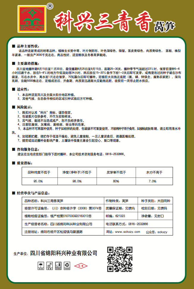 1、購買時認準“科興”商標,謹防假冒。2、包裝圖片僅供參考,不作為實物樣本。3.因氣候、栽培不當造成減產,想不負經濟責任。4.注意軟腐病、灰需病、菌核病、蚜蟲等的危害。5、本品種不可再留種使用、種子如經拌藥處理,包裝袋不可重復使用,不能將種子用于食用.如接觸皮膚眼睛,請立即用清水沖洗。6,如短期貯藏,請貯存于低溫干燥處,避免兒童接.一旦兒童誤食后.請遵醫處理。7、高溫季節栽培易抽苔,因此要加強肥水管理,否則會造成產量降低。萵筍不宜連作.連作病蟲害嚴重