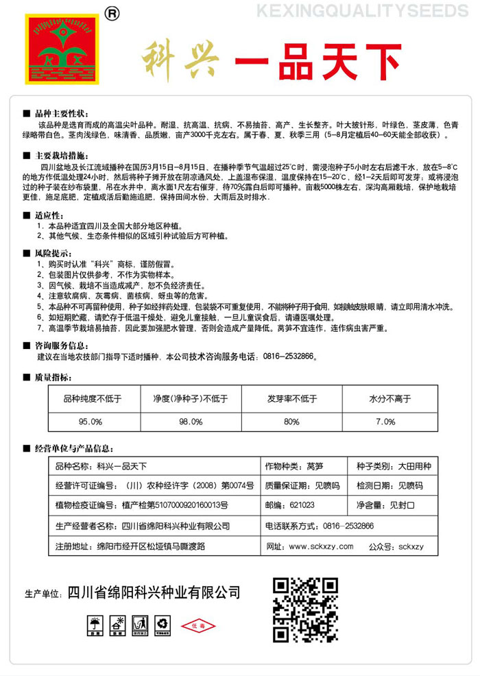1、購(gòu)買時(shí)認(rèn)準(zhǔn)“科興”商標(biāo),謹(jǐn)防假冒。2、包裝圖片僅供參考,不作為實(shí)物樣本。3.因氣候、栽培不當(dāng)造成減產(chǎn),想不負(fù)經(jīng)濟(jì)責(zé)任。4.注意軟腐病、灰需病、菌核病、蚜蟲等的危害。5、本品種不可再留種使用、種子如經(jīng)拌藥處理,包裝袋不可重復(fù)使用,不能將種子用于食用.如接觸皮膚眼睛,請(qǐng)立即用清水沖洗。6,如短期貯藏,請(qǐng)貯存于低溫干燥處,避免兒童接.一旦兒童誤食后.請(qǐng)遵醫(yī)處理。7、高溫季節(jié)栽培易抽苔,因此要加強(qiáng)肥水管理,否則會(huì)造成產(chǎn)量降低。萵筍不宜連作.連作病蟲害嚴(yán)重