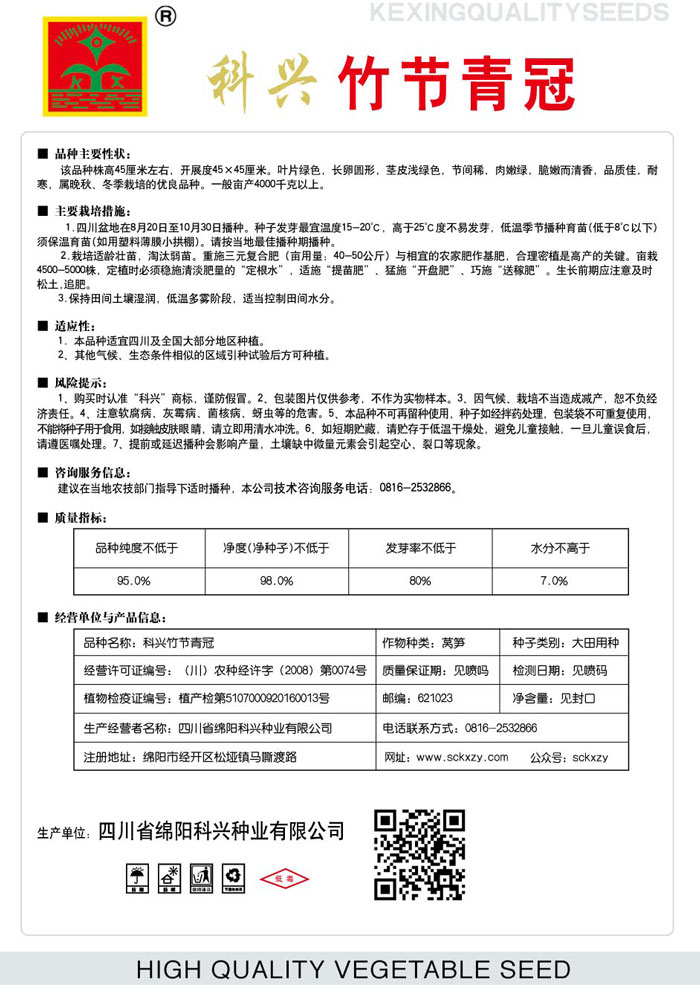 1、購買時認準“科興”商標,謹防假冒。2、包裝圖片僅供參考,不作為實物樣本。3.因氣候、栽培不當造成減產,想不負經濟責任。4.注意軟腐病、灰需病、菌核病、蚜蟲等的危害。5、本品種不可再留種使用、種子如經拌藥處理,包裝袋不可重復使用,不能將種子用于食用.如接觸皮膚眼睛,請立即用清水沖洗。6,如短期貯藏,請貯存于低溫干燥處,避免兒童接.一旦兒童誤食后.請遵醫處理。7、高溫季節栽培易抽苔,因此要加強肥水管理,否則會造成產量降低。萵筍不宜連作.連作病蟲害嚴重