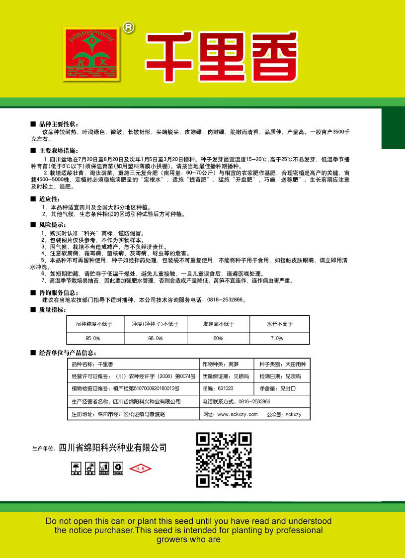 1、購買時認準“科興”商標,謹防假冒。2、包裝圖片僅供參考,不作為實物樣本。3.因氣候、栽培不當造成減產,想不負經濟責任。4.注意軟腐病、灰需病、菌核病、蚜蟲等的危害。5、本品種不可再留種使用、種子如經拌藥處理,包裝袋不可重復使用,不能將種子用于食用。如接觸皮膚眼睛,請立即用清水沖洗。6,如短期貯藏,請貯存于低溫干燥處,避免兒童接.一旦兒童誤食后.請遵醫(yī)處理。7、高溫季節(jié)栽培易抽苔,因此要加強肥水管理,否則會造成產量降低。萵筍不宜連作.連作病蟲害嚴重