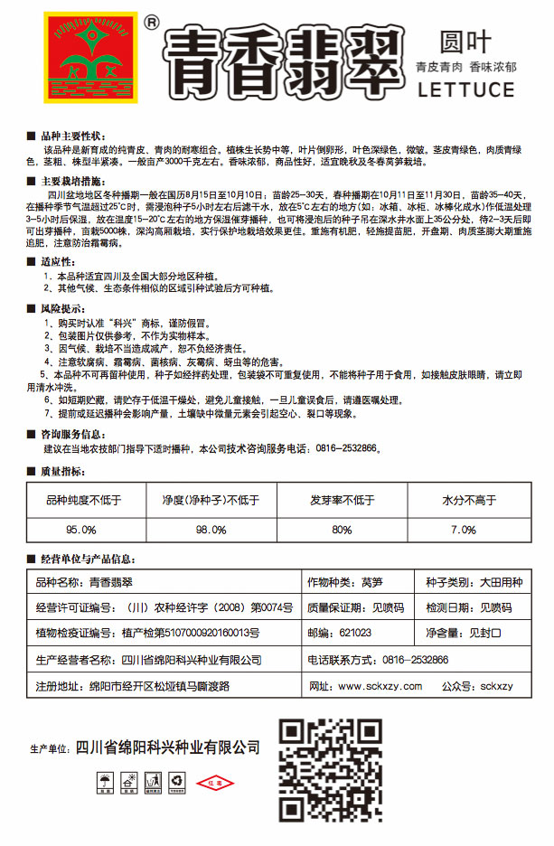 1、購買時認準“科興”商標,謹防假冒。2、包裝圖片僅供參考,不作為實物樣本。3.因氣候、栽培不當造成減產,想不負經濟責任。4.注意軟腐病、灰需病、菌核病、蚜蟲等的危害。5、本品種不可再留種使用、種子如經拌藥處理,包裝袋不可重復使用,不能將種子用于食用。如接觸皮膚眼睛,請立即用清水沖洗。6,如短期貯藏,請貯存于低溫干燥處,避免兒童接.一旦兒童誤食后.請遵醫處理。7、高溫季節栽培易抽苔,因此要加強肥水管理,否則會造成產量降低。萵筍不宜連作.連作病蟲害嚴重