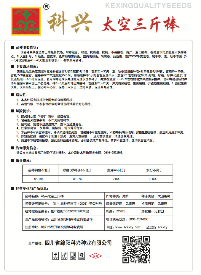 1、購買時認準“科興”商標,謹防假冒。2、包裝圖片僅供參考,不作為實物樣本。3.因氣候、栽培不當造成減產,想不負經濟責任。4.注意軟腐病、灰需病、菌核病、蚜蟲等的危害。5、本品種不可再留種使用、種子如經拌藥處理,包裝袋不可重復使用,不能將種子用于食用。如接觸皮膚眼睛,請立即用清水沖洗。6,如短期貯藏,請貯存于低溫干燥處,避免兒童接.一旦兒童誤食后.請遵醫處理。7、高溫季節栽培易抽苔,因此要加強肥水管理,否則會造成產量降低。萵筍不宜連作.連作病蟲害嚴重