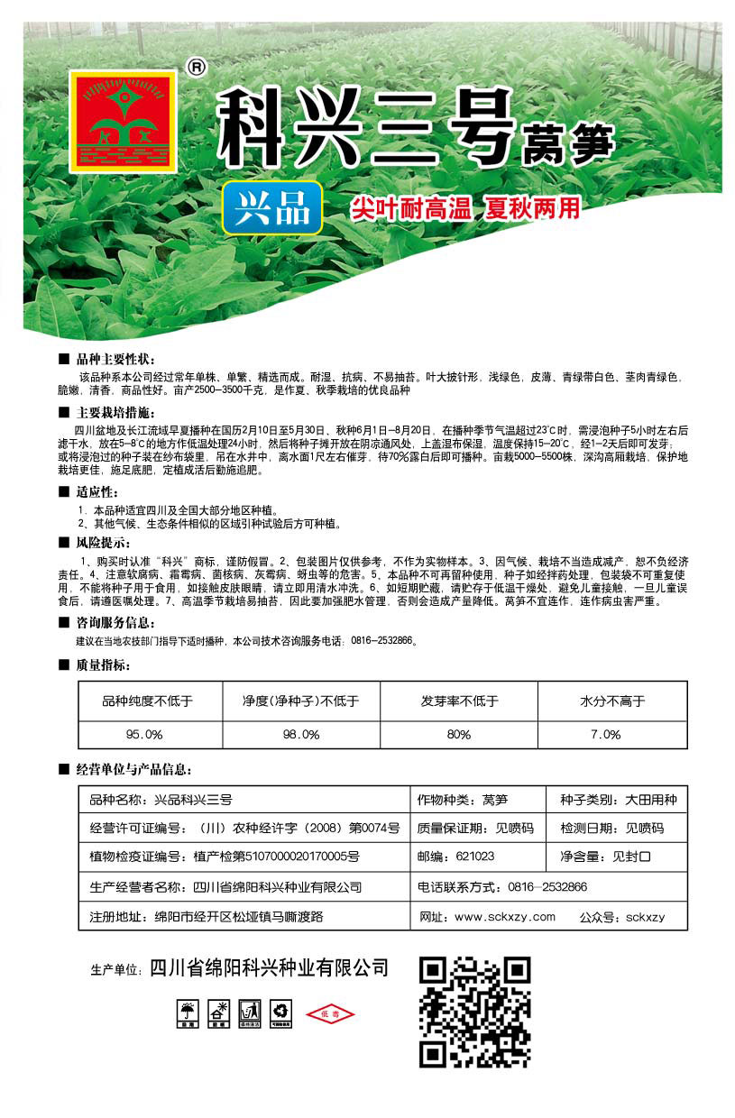 1、購買時認準“科興”商標,謹防假冒。2、包裝圖片僅供參考,不作為實物樣本。3.因氣候、栽培不當造成減產,想不負經濟責任。4.注意軟腐病、灰需病、菌核病、蚜蟲等的危害。5、本品種不可再留種使用、種子如經拌藥處理,包裝袋不可重復使用,不能將種子用于食用。如接觸皮膚眼睛,請立即用清水沖洗。6,如短期貯藏,請貯存于低溫干燥處,避免兒童接.一旦兒童誤食后.請遵醫處理。7、高溫季節栽培易抽苔,因此要加強肥水管理,否則會造成產量降低。萵筍不宜連作.連作病蟲害嚴重