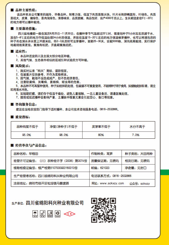 1、購買時認準“科興”商標,謹防假冒。2、包裝圖片僅供參考,不作為實物樣本。3.因氣候、栽培不當造成減產,想不負經濟責任。4.注意軟腐病、灰需病、菌核病、蚜蟲等的危害。5、本品種不可再留種使用、種子如經拌藥處理,包裝袋不可重復使用,不能將種子用于食用。如接觸皮膚眼睛,請立即用清水沖洗。6,如短期貯藏,請貯存于低溫干燥處,避免兒童接.一旦兒童誤食后.請遵醫(yī)處理。7、高溫季節(jié)栽培易抽苔,因此要加強肥水管理,否則會造成產量降低。萵筍不宜連作.連作病蟲害嚴重