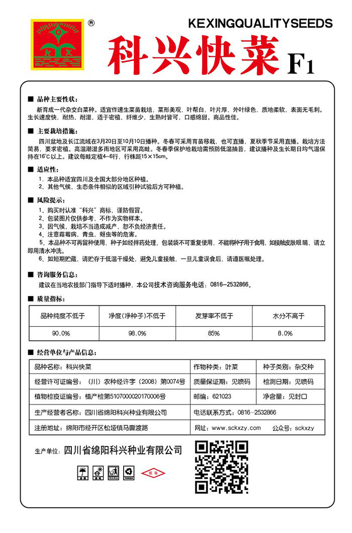 1、購買時(shí)認(rèn)準(zhǔn)“科興”商標(biāo),謹(jǐn)防假冒。2、包裝圖片僅供參考,不作為實(shí)物樣本。3.因氣候、栽培不當(dāng)造成減產(chǎn),想不負(fù)經(jīng)濟(jì)責(zé)任。4.注意軟腐病、灰需病、菌核病、蚜蟲等的危害。5、本品種不可再留種使用、種子如經(jīng)拌藥處理,包裝袋不可重復(fù)使用,不能將種子用于食用。如接觸皮膚眼睛,請立即用清水沖洗。6,如短期貯藏,請貯存于低溫干燥處,避免兒童接.一旦兒童誤食后.請遵醫(yī)處理。7、高溫季節(jié)栽培易抽苔,因此要加強(qiáng)肥水管理,否則會造成產(chǎn)量降低。