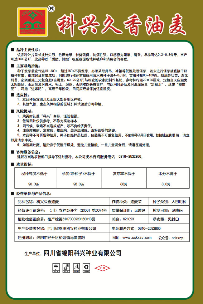 1、購買時認準“科興”商標,謹防假冒。2、包裝圖片僅供參考,不作為實物樣本。3.因氣候、栽培不當造成減產,想不負經濟責任。4.注意軟腐病、灰需病、菌核病、蚜蟲等的危害。5、本品種不可再留種使用、種子如經拌藥處理,包裝袋不可重復使用,不能將種子用于食用。如接觸皮膚眼睛,請立即用清水沖洗。6,如短期貯藏,請貯存于低溫干燥處,避免兒童接.一旦兒童誤食后.請遵醫處理。7、高溫季節栽培易抽苔,因此要加強肥水管理,否則會造成產量降低。