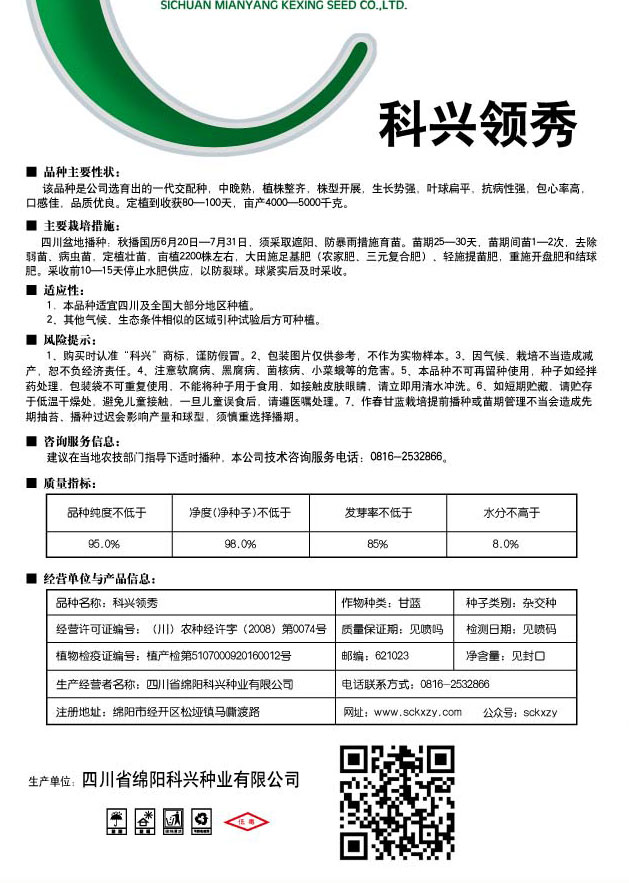 1、購買時認準“科興”商標,謹防假冒。2、包裝圖片僅供參考,不作為實物樣本。3.因氣候、栽培不當造成減產,想不負經濟責任。4.注意軟腐病、灰需病、菌核病、蚜蟲等的危害。5、本品種不可再留種使用、種子如經拌藥處理,包裝袋不可重復使用,不能將種子用于食用。如接觸皮膚眼睛,請立即用清水沖洗。6,如短期貯藏,請貯存于低溫干燥處,避免兒童接.一旦兒童誤食后.請遵醫處理。7、高溫季節栽培易抽苔,因此要加強肥水管理,否則會造成產量降低。