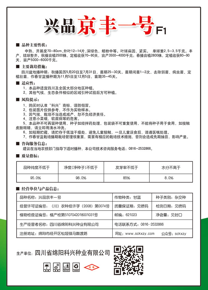 1、購買時認準“科興”商標,謹防假冒。2、包裝圖片僅供參考,不作為實物樣本。3.因氣候、栽培不當造成減產,想不負經濟責任。4.注意軟腐病、灰需病、菌核病、蚜蟲等的危害。5、本品種不可再留種使用、種子如經拌藥處理,包裝袋不可重復使用,不能將種子用于食用。如接觸皮膚眼睛,請立即用清水沖洗。6,如短期貯藏,請貯存于低溫干燥處,避免兒童接.一旦兒童誤食后.請遵醫處理。7、高溫季節栽培易抽苔,因此要加強肥水管理,否則會造成產量降低。