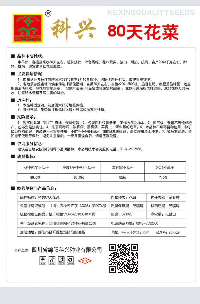 1、購買時(shí)認(rèn)準(zhǔn)“科興”商標(biāo),謹(jǐn)防假冒。2、包裝圖片僅供參考,不作為實(shí)物樣本。3.因氣候、栽培不當(dāng)造成減產(chǎn),想不負(fù)經(jīng)濟(jì)責(zé)任。4.注意軟腐病、灰需病、菌核病、蚜蟲等的危害。5、本品種不可再留種使用、種子如經(jīng)拌藥處理,包裝袋不可重復(fù)使用,不能將種子用于食用。如接觸皮膚眼睛,請立即用清水沖洗。6,如短期貯藏,請貯存于低溫干燥處,避免兒童接.一旦兒童誤食后.請遵醫(yī)處理。7、高溫季節(jié)栽培易抽苔,因此要加強(qiáng)肥水管理,否則會(huì)造成產(chǎn)量降低。