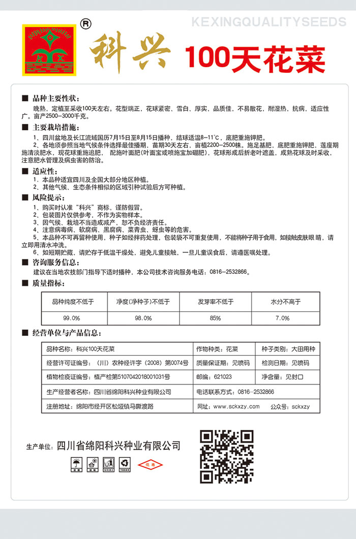1、購買時認準“科興”商標,謹防假冒。2、包裝圖片僅供參考,不作為實物樣本。3.因氣候、栽培不當造成減產,想不負經濟責任。4.注意軟腐病、灰需病、菌核病、蚜蟲等的危害。5、本品種不可再留種使用、種子如經拌藥處理,包裝袋不可重復使用,不能將種子用于食用。如接觸皮膚眼睛,請立即用清水沖洗。6,如短期貯藏,請貯存于低溫干燥處,避免兒童接.一旦兒童誤食后.請遵醫處理。7、高溫季節栽培易抽苔,因此要加強肥水管理,否則會造成產量降低。