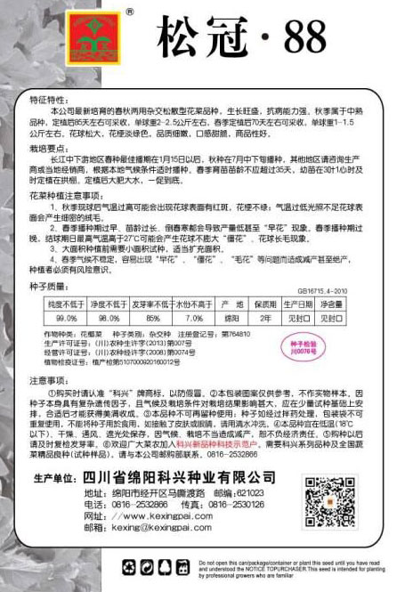 1、購買時認準“科興”商標,謹防假冒。2、包裝圖片僅供參考,不作為實物樣本。3.因氣候、栽培不當造成減產,想不負經濟責任。4.注意軟腐病、灰需病、菌核病、蚜蟲等的危害。5、本品種不可再留種使用、種子如經拌藥處理,包裝袋不可重復使用,不能將種子用于食用。如接觸皮膚眼睛,請立即用清水沖洗。6,如短期貯藏,請貯存于低溫干燥處,避免兒童接.一旦兒童誤食后.請遵醫處理。7、高溫季節栽培易抽苔,因此要加強肥水管理,否則會造成產量降低。